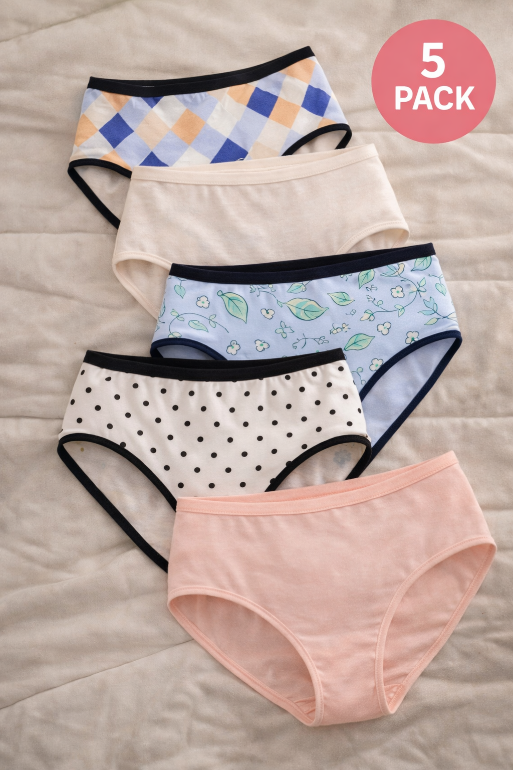 Designed for everyday comfort, the Women's Midi Panties – 5-Pack offer a soft, breathable feel with a flattering midi cut. Made from a premium modal cotton blend, these panties provide a smooth, lightweight fit with just the right amount of stretch. Featuring all-over prints and youthful color, they add a stylish touch to your essentials while ensuring all-day ease.